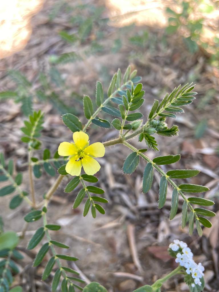 Yere yatık biçimde büyüyen Demir Dikeni, açık sarı çiçekleri ve dikenli meyveleri ile kolayca tanınır.